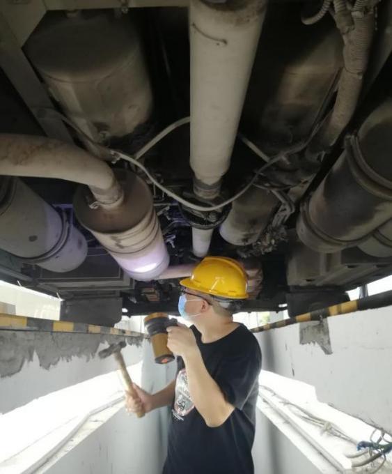 一把榔頭只為堅守源頭安全。在車站車輛例檢處,例檢員劉海正在烈日下作業(yè),滾燙的水泥地面、發(fā)熱的客車底盤和客車尾氣讓車輛例檢臺溫度更高。劉海不停地在車輛底部鉆進(jìn)鉆出,從燈光、轉(zhuǎn)向、制動、底盤,到車胎、螺絲、安全帶、消防錘等,認(rèn)真檢查著每一個車輛部件??蛙嚨撞康母邷刈屗氯ヒ淮伪闳頋裢敢淮?,臉上的汗也順著頭發(fā)往下滴落。說起自己的工作,劉海認(rèn)為雖然工作環(huán)境惡劣一些,但是與售票員、檢票員并沒有什么不一樣,只是分工不同,做好車輛例檢工作,保障客車運(yùn)行安全,是我們的責(zé)任,目的都是為旅客出行服務(wù)。
